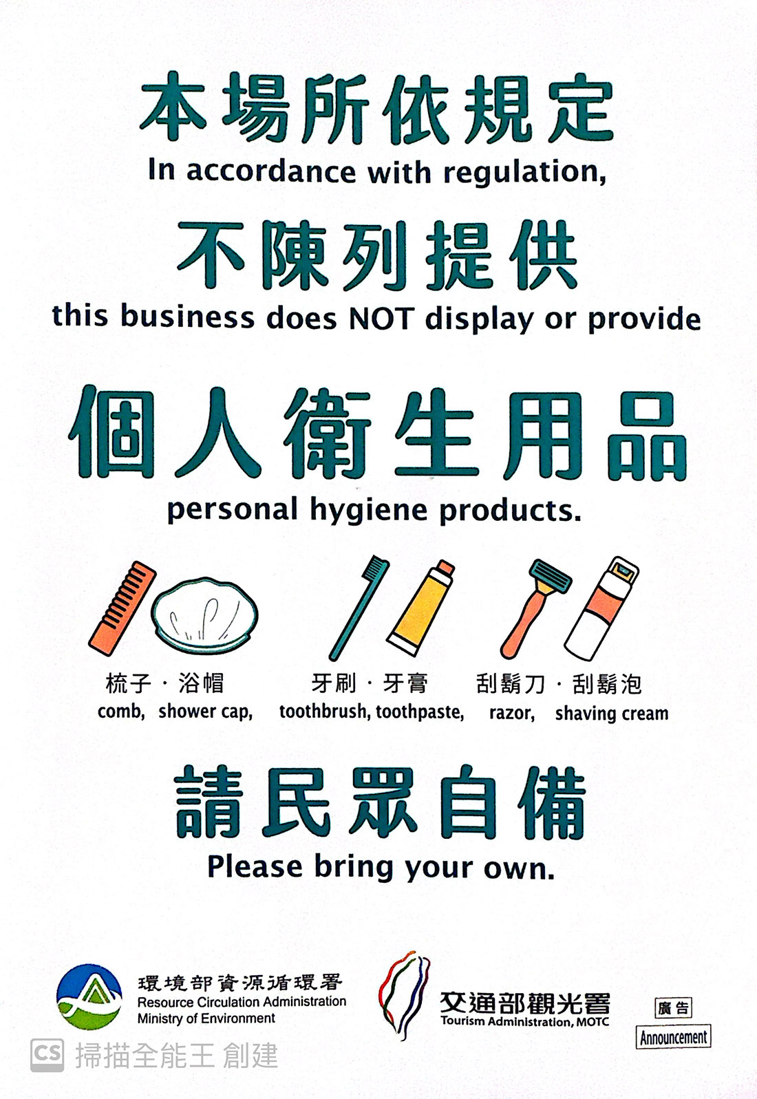 26AUG 2024-08-26 (圖文出自:環境部資源循環署、交通部觀光署) 本場所依規定 In accordance with regulation, 不陳列提供 this business does NOT display or provide 個人衛生用品 personal hygiene products. 梳子·浴帽 牙刷·牙膏 刮鬍刀·刮鬍泡 comb, shower cap, toothbrush,toothpaste, razor, shaving cream 請民眾自備 Please bring your own.