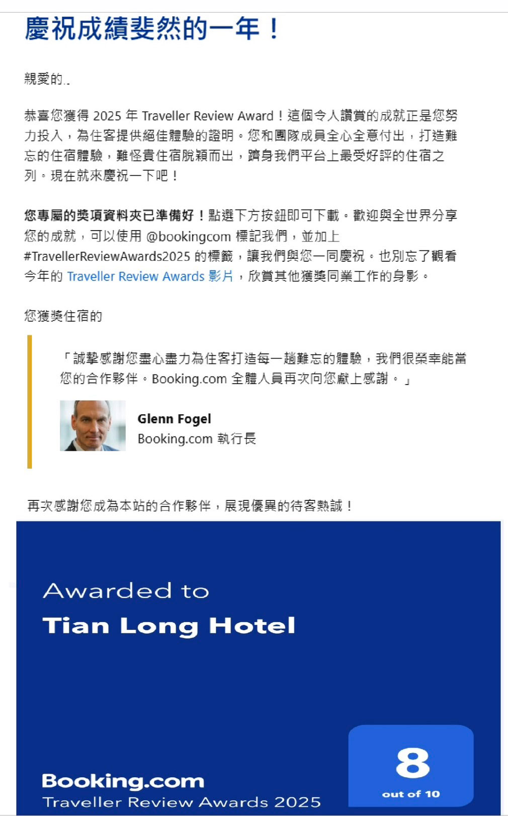 03FEB 2025-02-03 (圖文出自:booking.com) 慶祝成績斐然的一年! 親愛的.. 恭喜您獲得 2025年 Traveller Review Award!這個令人讀賞的成就正是您努力投入,為住客提供絕佳體驗的證明。您和團隊成員全心全意付出,打造難忘的住宿體驗,難怪貴住宿脫穎而出,躋身我們平台上最受好評的住宿之列。現在就來慶祝一下吧!