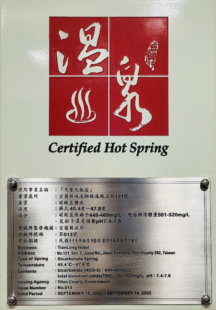 天隆大飯店已領到溫泉標章了
