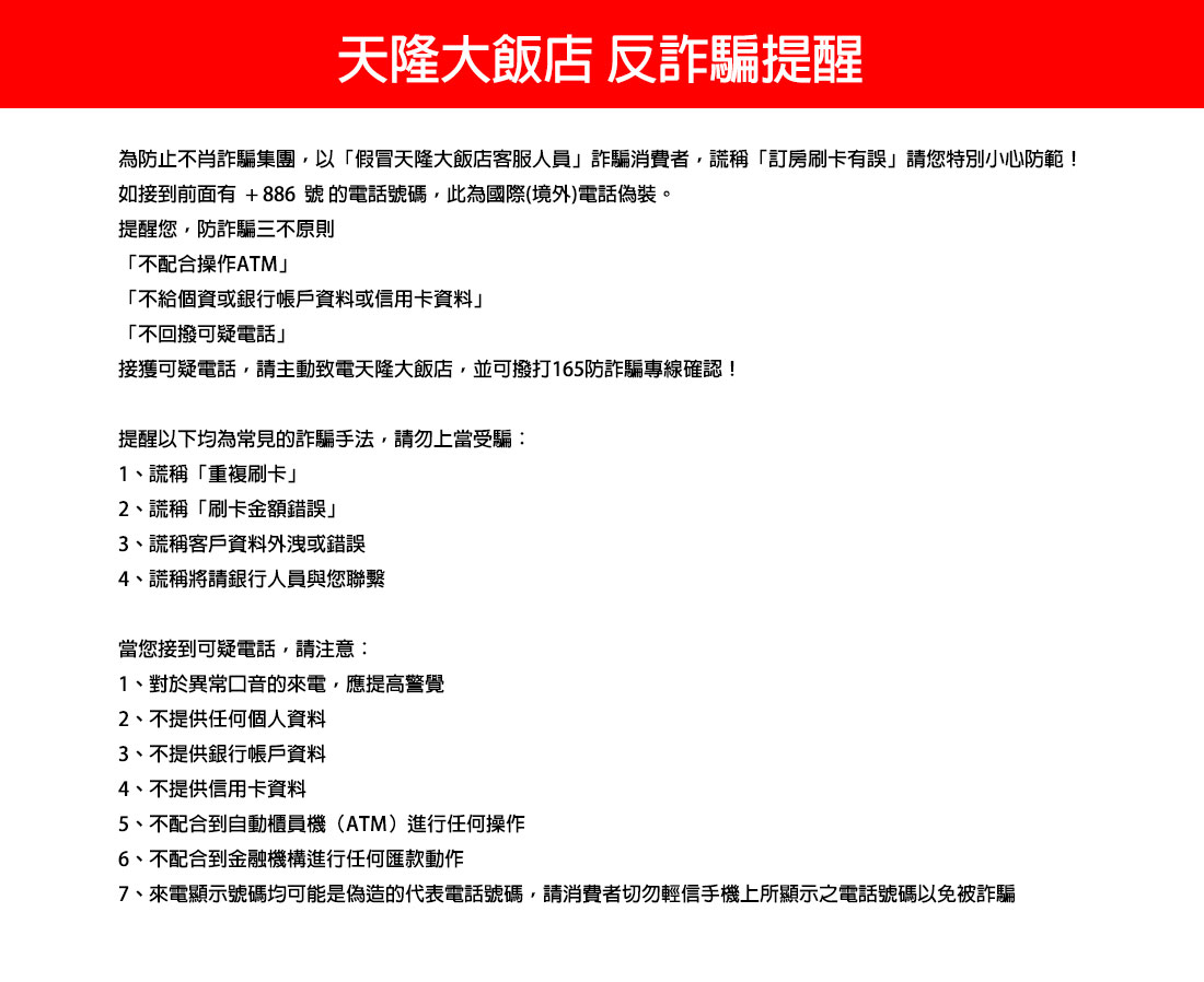 接獲可疑電話,請主動致電天隆大飯店,並可撥打165防詐騙專線確認!